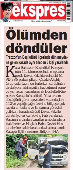 Trabzon’a bağlı Akçiriş mahallesi sakinlerinden D.F. idaresindeki 61 PD 786 Plakalı pikap ile eşi S. F, Kızı S. F ile Beşikdüzü İlçesinden ikamet ettiği Akçiriş’e döndüğü sırada Çıtlaklı Akçiriş grup yolunun 100’ncü metresinde direksiyon hakimiyetini kaybetmesi sonucu Beşikdüzü Şalpazarı Karayolunun 11. Km’ne düştü.