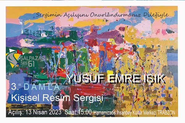 Trabzon Şalpazarı Akçiriş mahallesi merhum Asım & Keziban Yavuz çiftinin kızı Kadiriye Yavuz Işık Gümüşhane eşraflarından İstanbul Teknik Üniversitesinde görevli öğretim üyesi Doç. Dr. Mustafa Işık çiftinin 1986 doğumlu Trabzon Üniversitesi Güzel Sanatlar Fakültesi’nde Dr. Arş. Görevlisi olarak görev yapan Yusuf Emre Işık 3.Damla Kişisel resim sergisini Trabzon Hamamizade Kültür merkezi salonumuza tüm Resim severlerimizi bekliyorum.