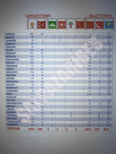 Şalpazarı Genelinde Kesin olamayan sonuçlara göre Cumhur İttifakı ve Millet İttifakının aldığı oy toplamı