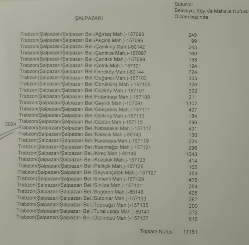 Trabzon’a bağlı 18 İlçeden Sahil kısmından iç kısımda bulunan İl merkezine 70 KM uzaklıkta bulunan 8 İlçeden birisi olan Şalpazarı İlçe nüfusu 2023 yılında 11.778 olan nüfusu /2024 yılı nüfusu 11.161 olarak belirlendi. Bu hesaplamalara göre Şalpazarı her yıl azalmaya devam ediyor. Bir önceki yıla oranla ilçemiz nüfusu 617 kişi azalmıştır.