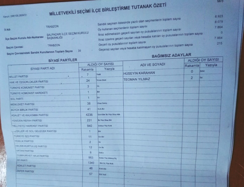 Şalpazarı’nda 14 Mayıs Milletvekili Seçiminde 19 Siyasi Partinin Oy Dağılımı şu şekilde oluştu.