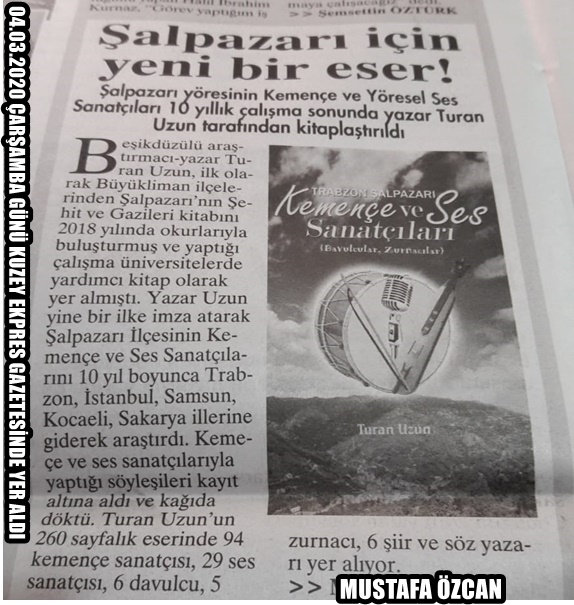 Trabzon Beşikdüzü’lü araştırmacı yazar Turan Uzun tarafından Türkiye de bir ilk olarak Büyükliman’a bağlı Şalpazarı İlçesinin Şehit ve Gazileri kitabını 2018 yılında okurlarıyla buluşturmuş ve  yaptığı çalışma Dünya Üniversitelerinde yardımcı kitap olarak yer almıştı. Yazar Uzun yine ilklere imza atarak Büyükliman Bölgesinde bulunan Şalpazarı İlçesinin Kemençe ve Ses Sanatçıları olarak 10 yıl boyunca Trabzon, İstanbul, Samsun, Kocaeli, Adapazarı, illerine bir zat giderek buralarda bulunan Kemençe ve ses sanatçılarıyla yaptığı söyleşileri kayıt altına almasıyla beraber ”Şalpazarı Kemençe ve Yöresel Ses Sanatçıları” kitabını tamamladığını belirten araştırmacı yazar Turan Uzun  260 sayfalık bu eserde 94 kemençe sanatçısı, 29 Ses sanatçısı, 6 Davulcu, 5 Zurnacı, 6 Şiir ve söz yazarının bulunduğu bu eser okuyucularıyla buluşuyor